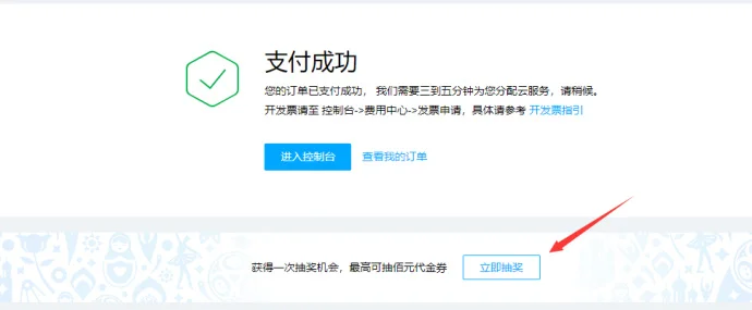 购买域名并成功支付后即可进行一次抽奖。仅在购买确认页当页有效,关闭支付确认页后无法找回抽奖机会!