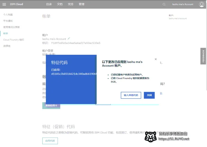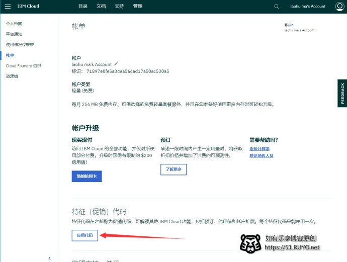 2)登录IBM Cloud账号!点击右上角头像 - 个人档案 - 账单 - 特征促销代码 - 应用代码