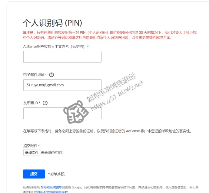 填写完提交!然后提示让等24小时,博主等了3个小时Gmail邮箱就收到PIN码了!