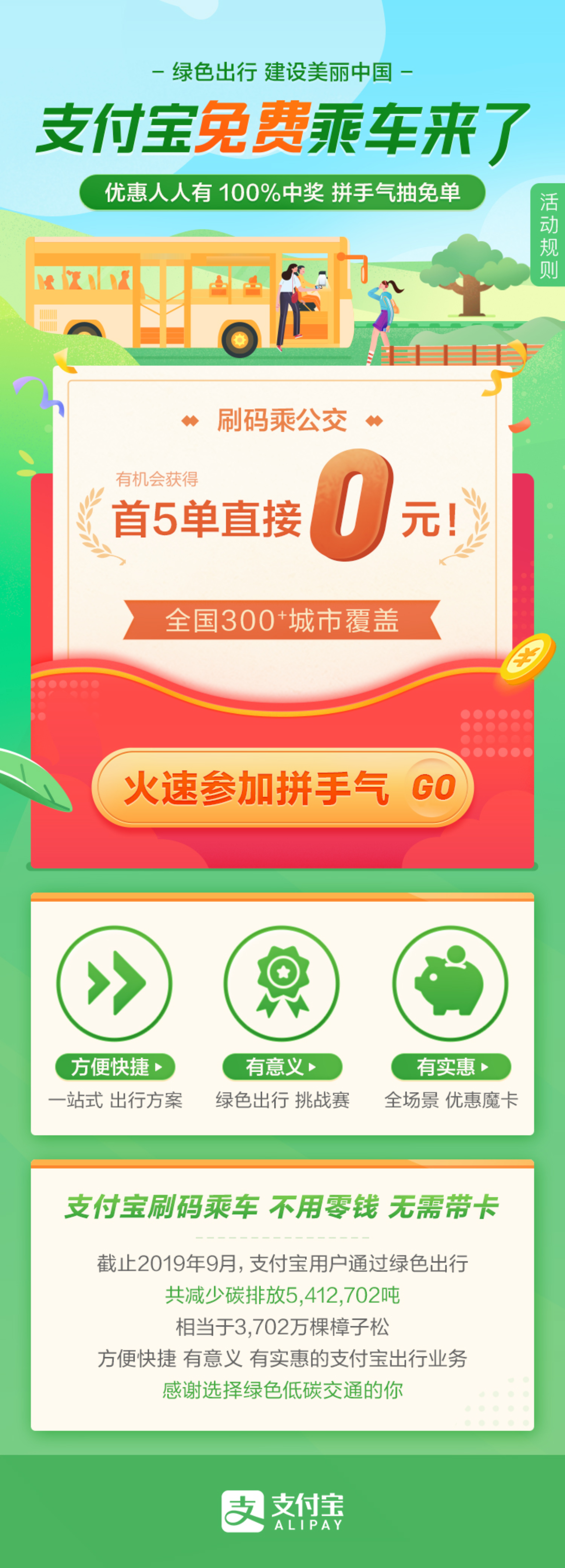 支付宝绿色出行,抽5次免费乘车(高概率中免单)