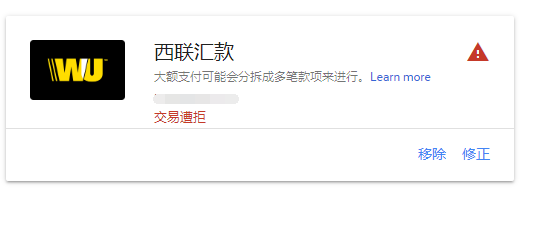 没过多久Adsense 西联汇款的方式,显示交易遭拒!只能另寻他法了!