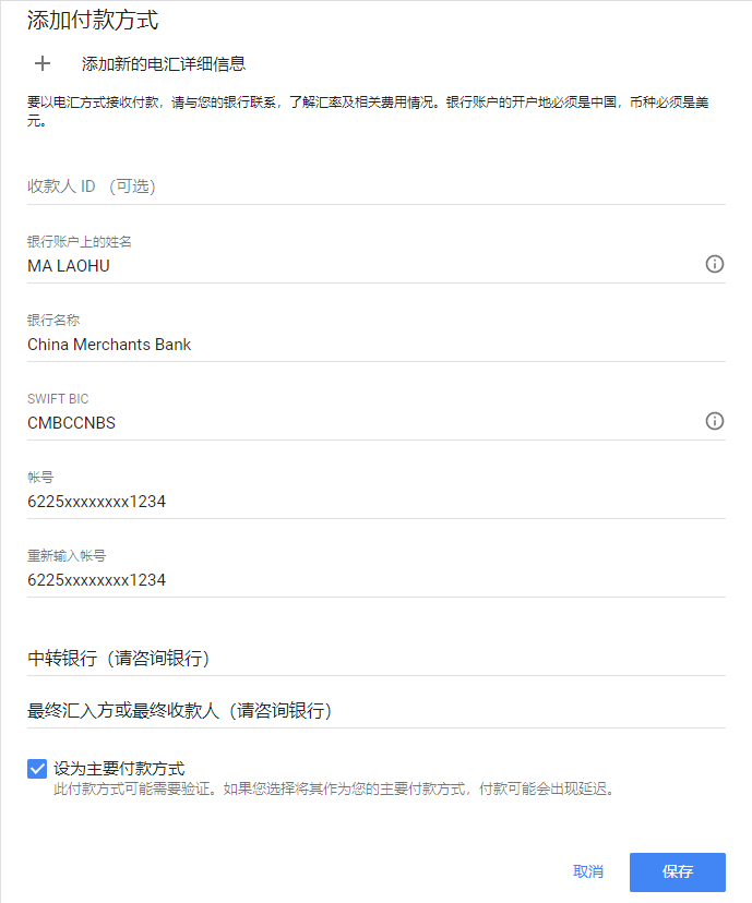 银行账户上的姓名:MA LAOHU (全拼大写)