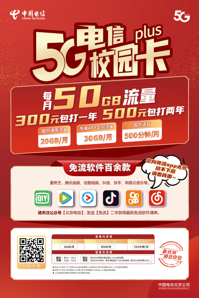 北京电信校园卡: 300元1年500元2年 20G全国流量+30G定向流量 仅20元/月
