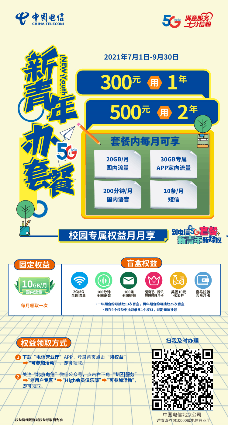 北京电信校园卡300元1年500元2年,流量20G通用+30G定向+500分钟通话
