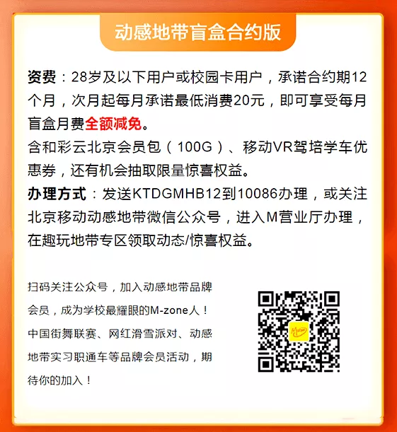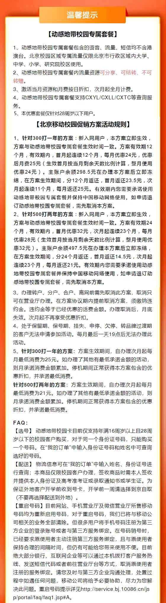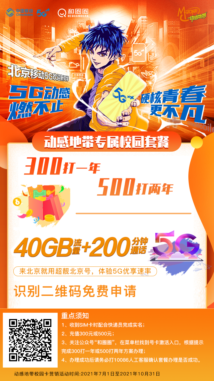 北京移动校园卡正式上线!资费300元打一年,500元打两年,每月包含20G全国通用流量、20G北京市内通用流量、200分钟通话,此外还可以通过抽取盲盒领取超多权益哦!