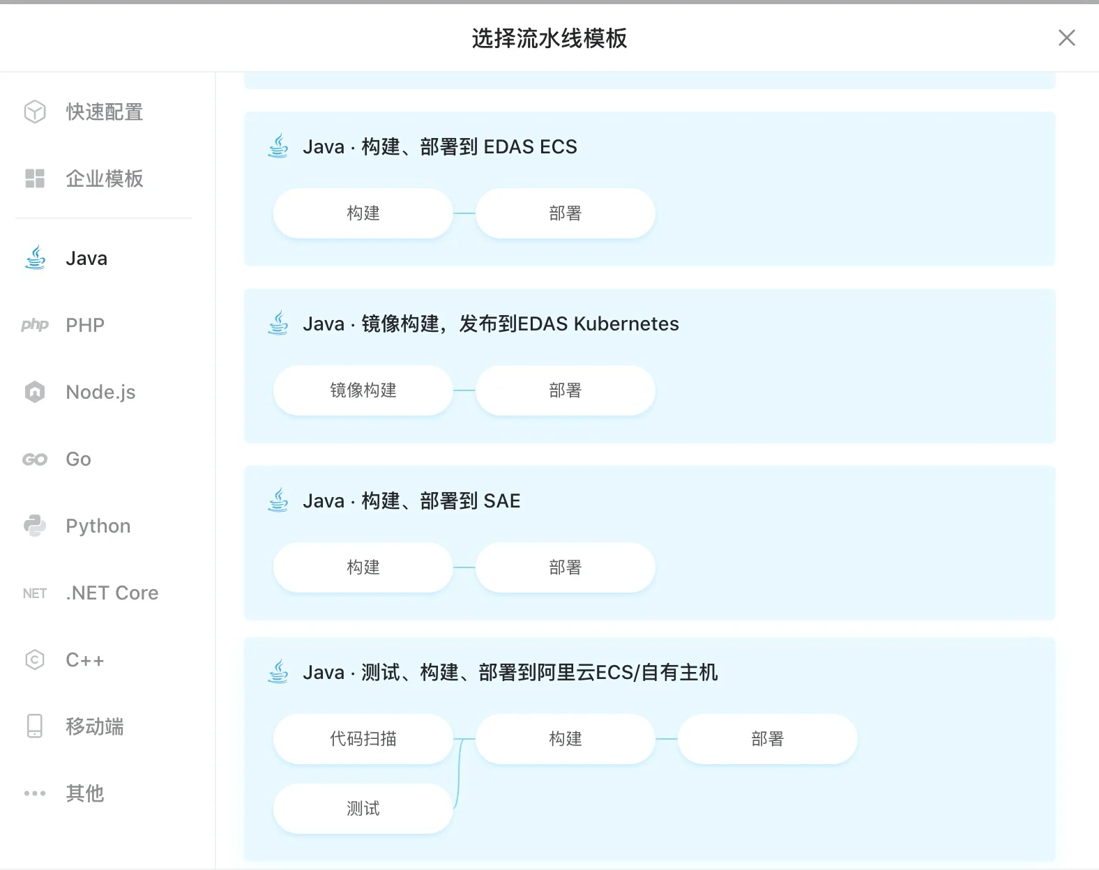 云效流水线,自动化研发流水线,交付过程简单高效,据说是离职的阿里人最想念的功能:提供数十种通用的流水线模版快速创建流水线,提供可视化编排和结果展现;内置代码扫描、安全扫描和各种自动化测试能力,实现持续集成、验证、发布功能。