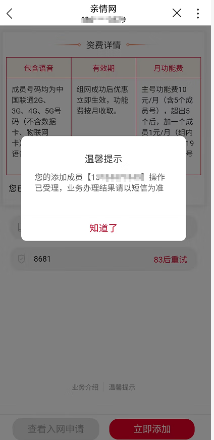 3.一个亲情网中只能有一个主号码,主号码添加成员号码,需成员号码确认;