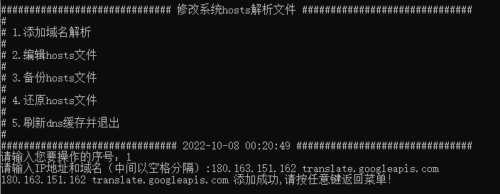 比较常用的三个 180.163.151.34 translate.googleapis.com 203.208.40.66 translate.googleapis.com 220.181.174.226 translate.googleapis.com 上海/电信: 180.163.150.34 180.163.151.162 180.163.150.162 180.163.150.33 上海/移动: 120.253.253.226 120.253.253.98 120.253.250.226 120.253.255.162 120.253.253.34 120.253.255.98 120.253.253.162 120.253.255.34 上海/Google数据中心/电信: 203.208.40.98 203.208.41.98 203.208.41.66 203.208.41.34 203.208.41.97 203.208.40.97 203.208.40.65 203.208.40.34 北京/电信: 220.181.174.34 220.181.174.98 220.181.174.162 220.181.174.33 203.208.50.162 北京/Google数据中心/电信: 203.208.43.66 203.208.39.194 203.208.50.66 203.208.43.98 203.208.50.34 203.208.39.226 北京/联通: 114.250.64.34 114.250.70.34 114.250.63.34 114.250.66.34 114.250.65.34 广州/电信: 113.108.239.226 58.63.233.98 113.108.239.162 广州/移动: 120.241.147.162 120.232.181.162 广州/联通: 58.254.137.226