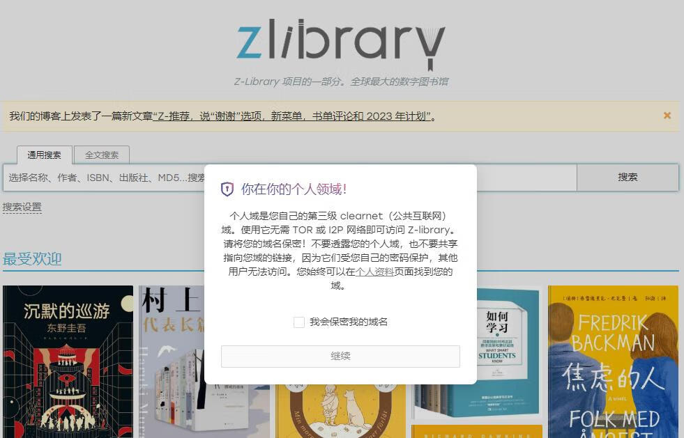 个人域是您自己的第三级 clearnet(公共互联网)域。使用它无需 TOR 或 I2P 网络即可访问 Z-library。请将您的域名保密!不要透露您的个人域,也不要共享指向您域的链接,因为它们受您自己的密码保护,其他用户无法访问。您始终可以在个人资料页面找到您的域。