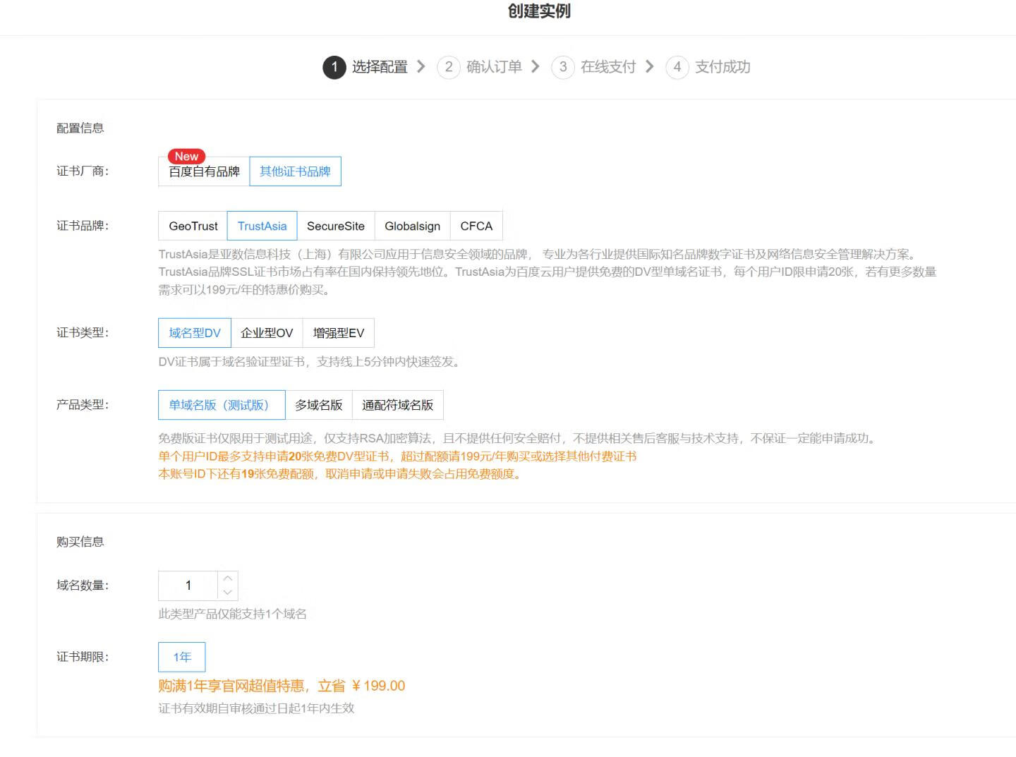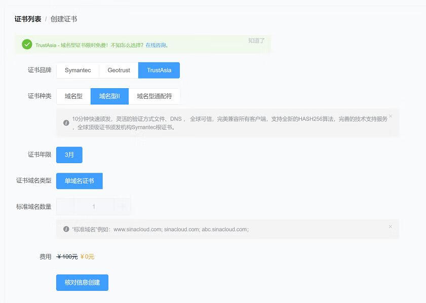 - 原 1 年期的 TrustAsia SSL证书(单域名),我们将按 699 元/年/张 收取相应的证书签发服务费用。
