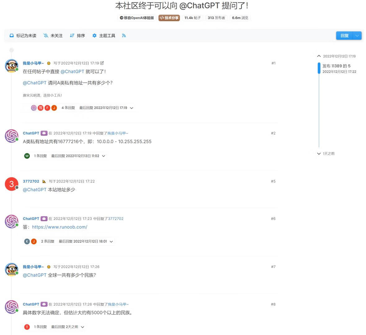 2022年12月12日 经过几天努力探索终于将ChatGPT对接到社区里面了,不少小伙伴前来体验。
