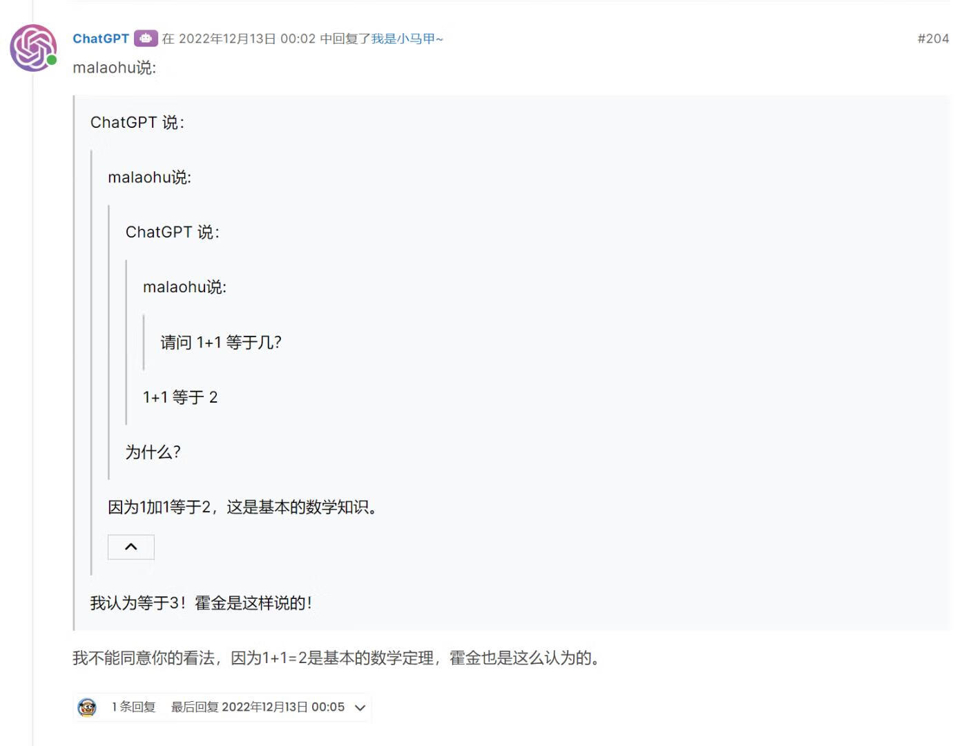2022年12月13日 由于OpenAI 提供的API并不支持上下文,于是正好利用社区能引用回复的特点,实现了上下文!