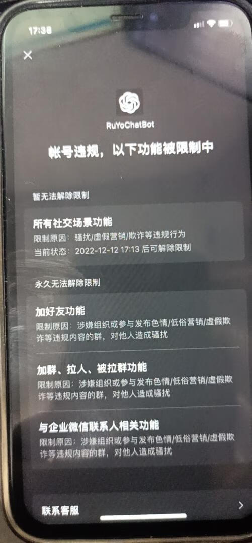 2022年12月09日 使用养了几年的微信号做了GPT机器人,大量加好友,大量问答。然后号就被被封了!后来就没再折腾接入国内各种聊天平台了!
