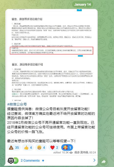 2018年2月开始微信公众号不再支持开通【留言】功能。已经开通留言功能的公众号可继续使用。于是乎市面上带留言功能公众号买卖的价格一路飞涨。