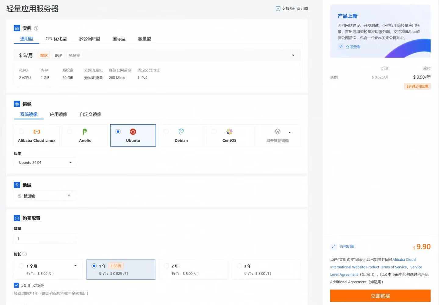 阿里云这个9.9美元机型上线有一段时间了!数据中心仅支持新加坡。这里写一篇测评文章!该活动机型每个账号仅能购买一次,新老用户均可购买!