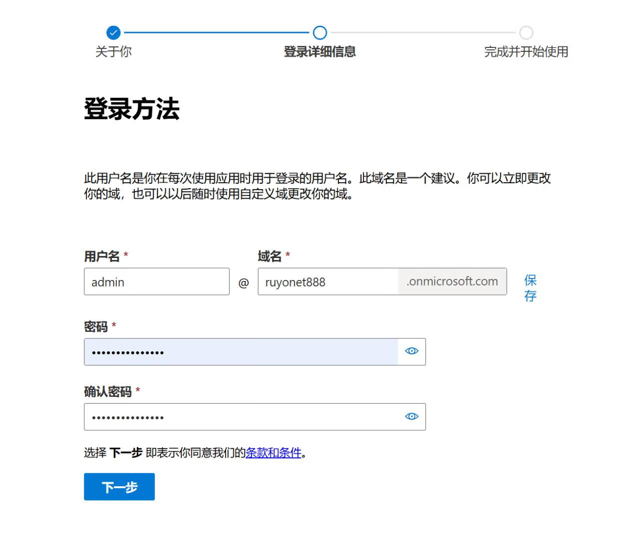 第二步:填写登陆方法。用户名建议使用admin,域名选择一个自己心仪的即可。按要求设置一个密码。
