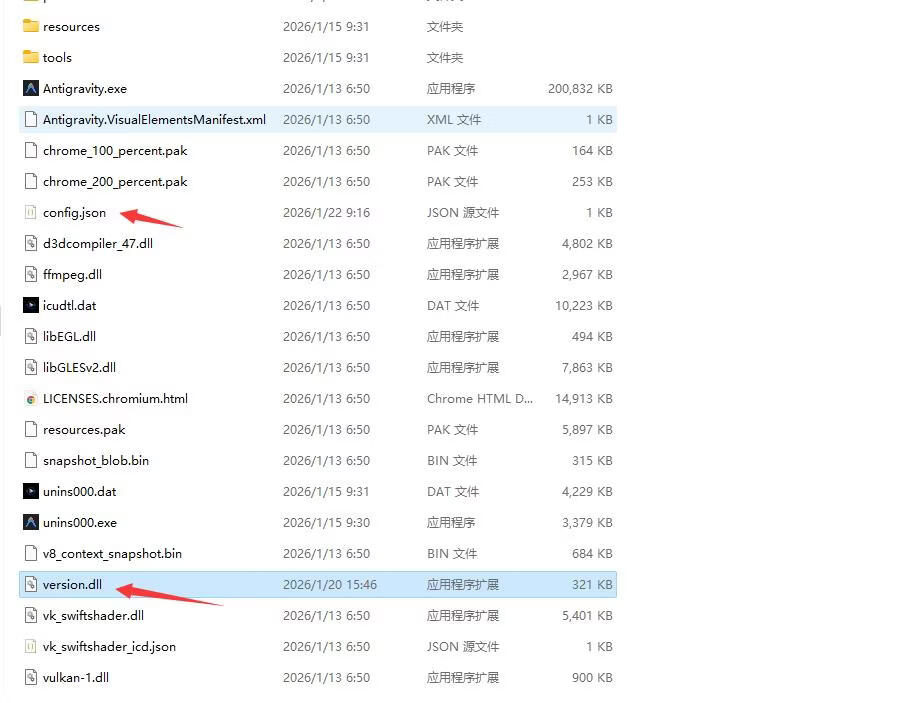 第三步:将 version.dll 和 config.json 俩个文件复制到 Antigravity 安装目录即可!