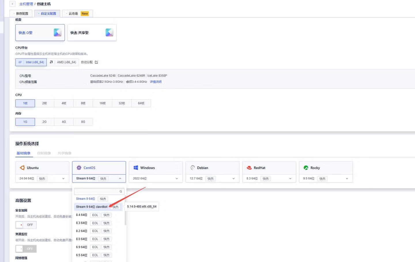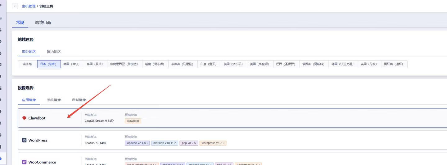 入口二:选择美国、新加坡、日本地域,然后选择CentOS系统,找到对应clawdbot镜像