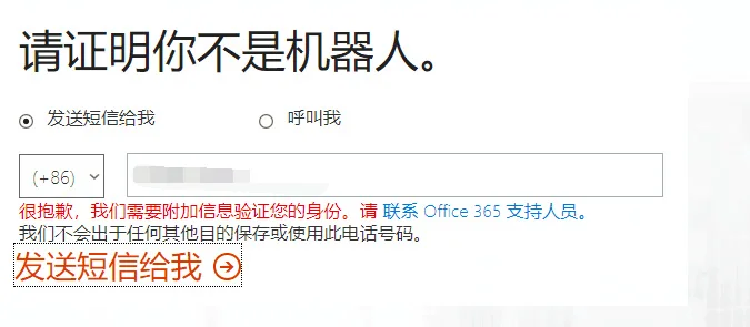 验证手机号出现以下提示:很抱歉,我们需要附加信息验证您的身份,请联系Office 365支持人员!