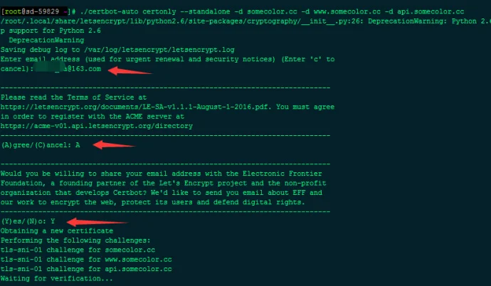./certbot-auto certonly --standalone -d somecolor.cc -d www.somecolor.cc -d api.somecolor.cc