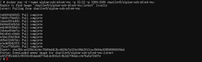 docker run -d --name alpine-ssh-xfce4-vnc -p 22:22 -p 3389:3389 charliev5/alpine-ssh-xfce4-vnc