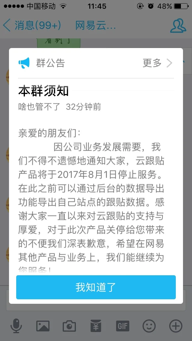 因公司业务发展需要,我们不得不遗憾地通知大家,云跟帖产品将于2017年8月1日停止服务。