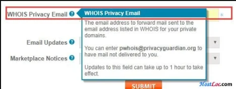 2)找到 WHOIS Privacy Email 修改为你的私人邮箱即可。生效时间可能在一小时左右,有提示。