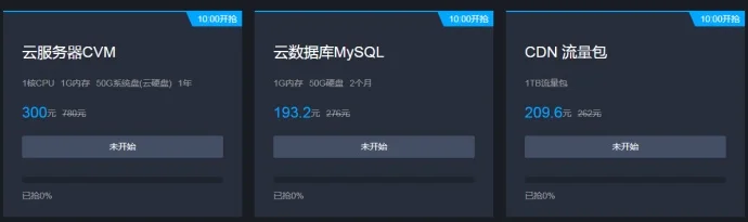 每周一至周五,每天三场(10:00,15:00,17:00)限量秒杀。云服务器CVM、云数据库MySQL、CDN流量包、短信套餐包、弹性缓存Redis、云解析等限量秒杀,不同场次,不同品类。