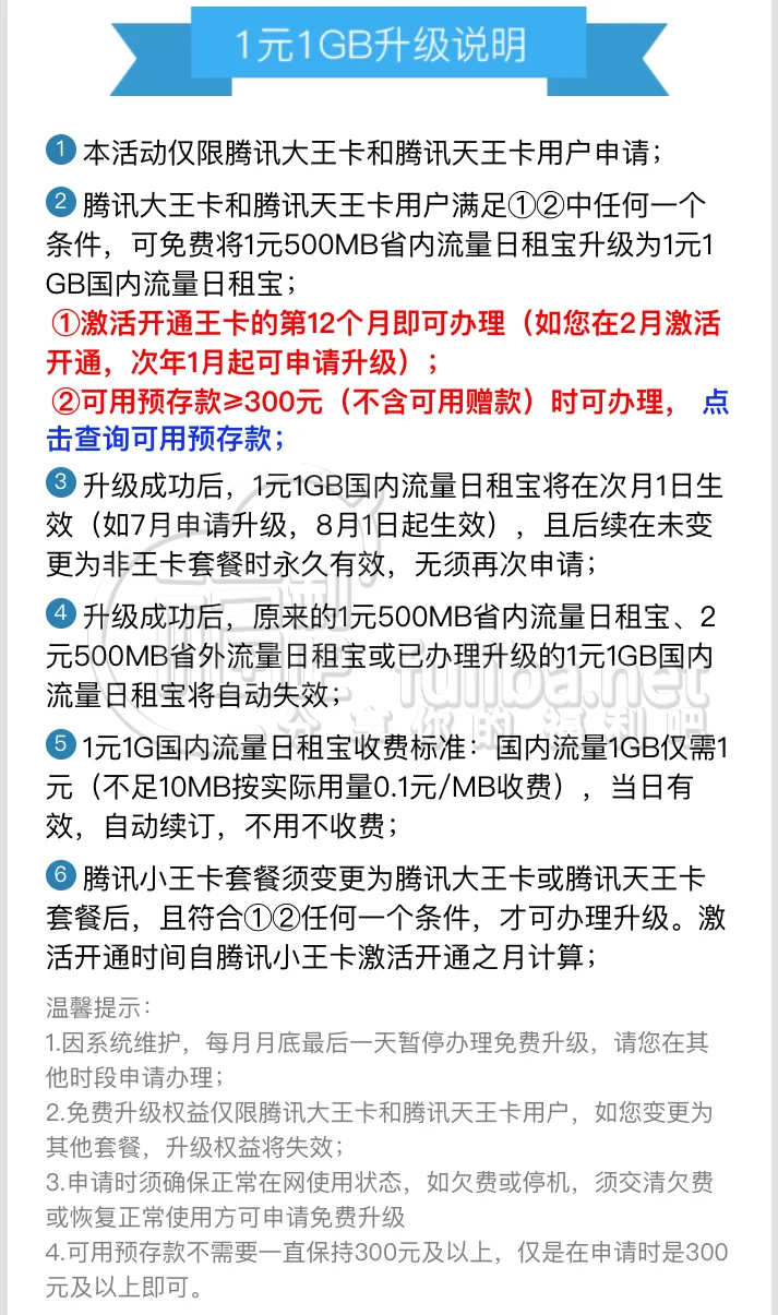 好消息!腾讯大王卡/天王卡日包升级1元1GB全国流量