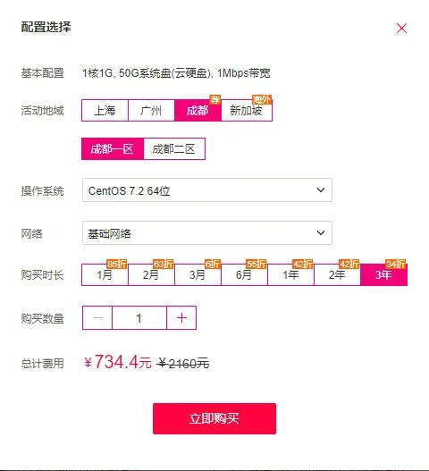 1核/1G内存/50G系统盘(云硬盘)/1Mbps带宽/3年只要734.4元! 并且找代理付款最低7折优惠!