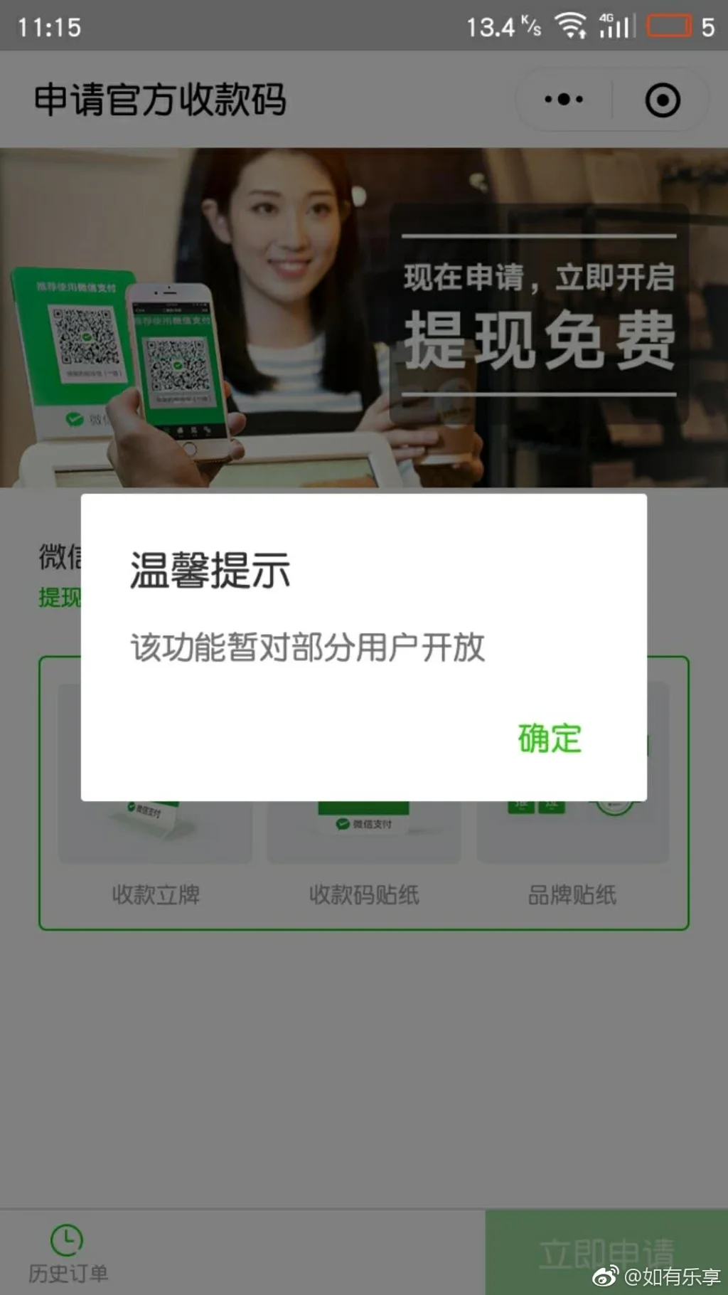 2018年1月17日09:32:51 更新:该方法申请官方收款码已经失效。提示:该功能暂对部分用户开放。已经申请的不受影响,一首凉凉送给大家。