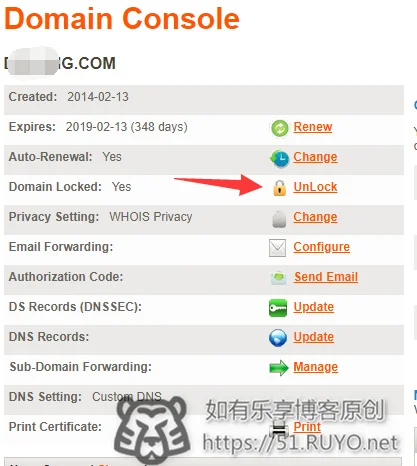一般域名商都会提供域名锁。我们先将域名锁关闭了。点击 【UnLock】!