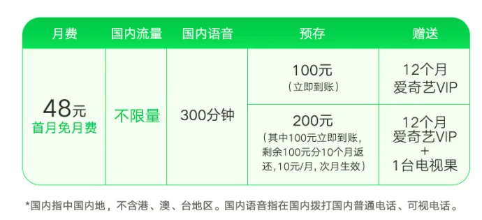 48元/月 = 国内流量不限 + 300分钟国内语音 + 送爱奇艺VIP + 1台电视果