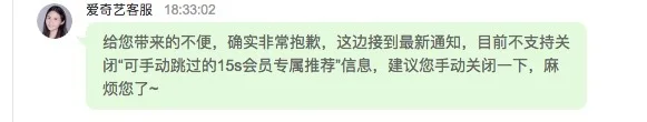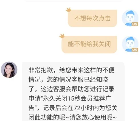 网上有好多朋友都分享了这个方法,就是找客服说:我要永久关闭15秒会员推荐广告!!!!然后可以客服就给你关闭了!